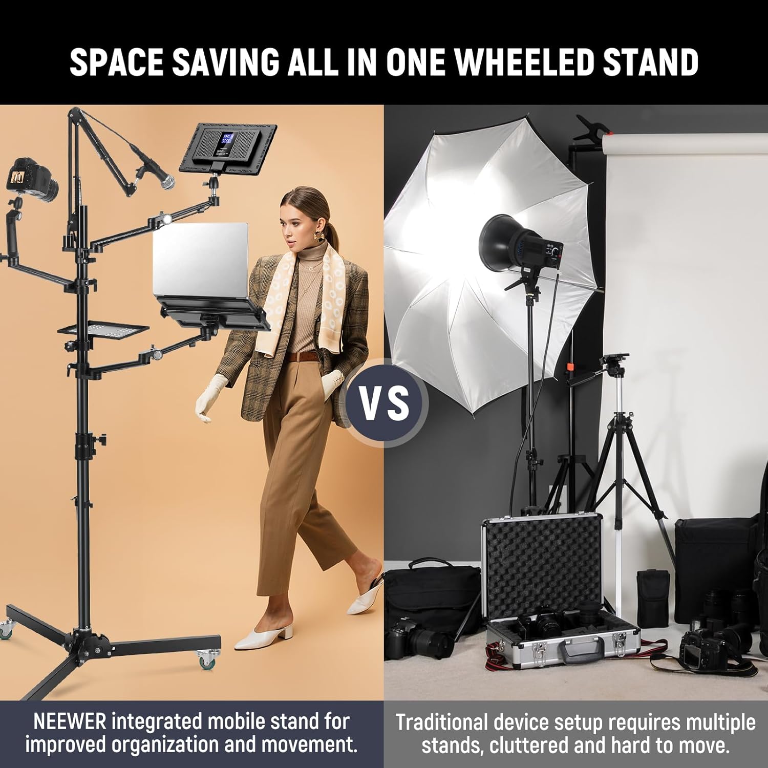 Suporte para transmissão ao vivo da NEEWER com rodízios, suporte de câmera suspensa com braço de microfone, suporte para telefone/tablet/notebook, bandeja, tudo em uma webcam móvel...